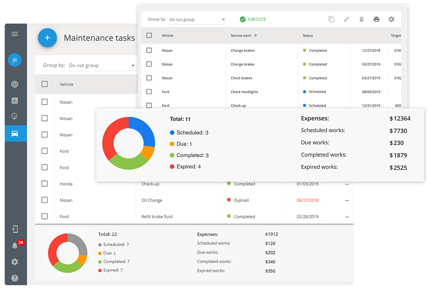 Manage the service checklist. View and print the list of planned maintenance at any time. Group jobs by vehicle types, fuel types and departments.